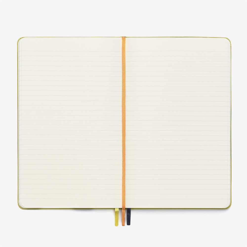 bords arrondis, fermeture élastique K-Way et marque-page en ruban